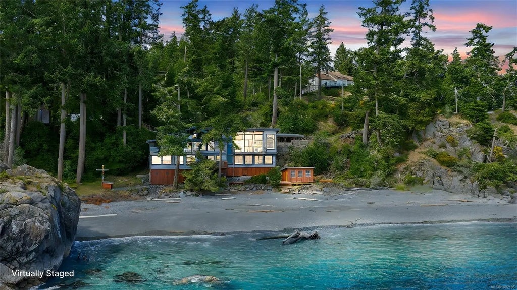 EXCLUSIVE OCEANFRONT ESTATE – A rare West Coast sanctuary tucked into a private cove, offering approx. 460ft of shoreline and panoramic views across the Juan de Fuca Strait to the Olympic Mountains. Meticulously crafted 3-bed + office, 4-bath residence on 1.1 acres of south-facing, sun-drenched land. Vaulted ceilings, Brazilian walnut floors, and picture windows frame every breathtaking vista. Indulge in a spa-level primary suite with oceanview soaker tub and steam shower. Gourmet kitchen with granite island, heated Italian tile, and high-end appliances. Includes a charming beach cabin and private guest cottage with hot tub—perfect for hosting or income. Whether entertaining or relaxing in solitude, this property delivers front-row seats to sunrise and sunset. Take a closer look—this is coastal luxury redefined.