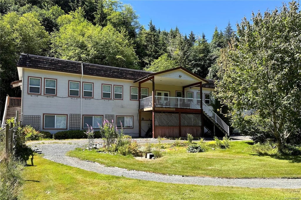 This expansive 20-acre property boasts proximity to the Salmon River, just a 25-minute stroll away, and is conveniently located near Kelsey Bay harbour, accessible by a short drive. The 8000 sq ft residence is suited for accommodating multiple generations or families under one roof. With its commercial kitchen, the potential for converting it back into a small lodge is not a problem, along with the fact that it is supported by a 10-room septic system. Situated within the ALR, access is via a paved forestry road. The property features a small livestock enclosure, a spacious garden area, and extensive level land, offering ample opportunities for development. New cork flooring, drop ceilings, overhead LED light fixtures, and a fresh coat of paint. Upstairs, the living room has been upgraded with new commercial-grade carpeting. Recent replacements include the septic pump and two water heaters, with the added convenience of an EV charging station. It even has a sauna. Great Value.