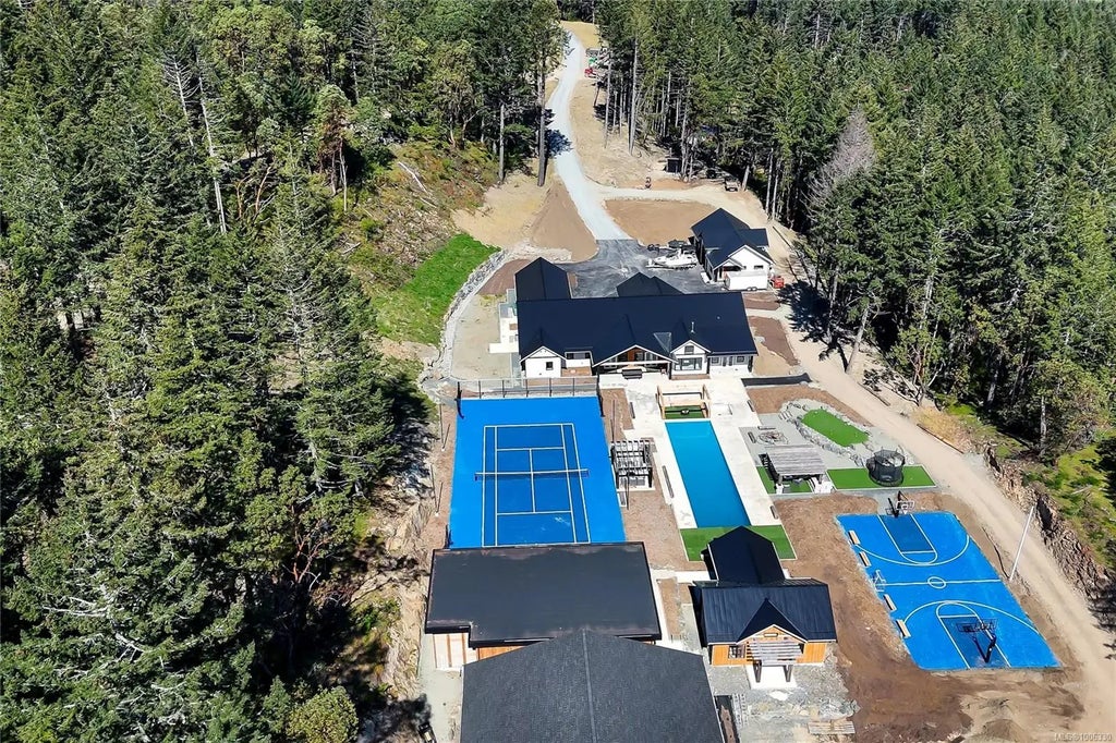 PRICE IMPROVED - LUXURY ESTATE! Discover the ultimate 30-acre family retreat on Vancouver Island, showcasing a newly completed 5000 sq/ft ICF-built rancher crafted for refined living and unforgettable entertaining. This exceptional estate boasts a 100-ft saltwater pool, tennis and basketball courts, putting green, 3 fire pits, helipad, and a dedicated dog wash with its own laundry. The elegant interior offers a theater room, radiant in-floor heating (incl. 3-car garage w/EV charger), and a showpiece living room with a striking fireplace flowing into a chef’s kitchen with waterfall quartz island and a full spice kitchen. The luxurious primary suite features dual walk-in closets, private laundry, and a spa-style ensuite with steam shower. Four additional bedrooms—two with ensuite access—plus a bonus family room offer flexible space for all. A 1,500 sq/ft shop, 2,000 sq/ft gym, 7,300 sq/ft multi-use building, and pool house complete this rare opportunity to own a resort-style sanctuary.