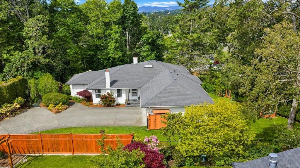 Wonderful rancher with 1 bedroom in-law suite in the walk-out basement. The home is located down a private pan handle lane and is nestled on wonderfully landscaped 14,000+ sq ft lot that backs onto dedicated park land. The home measures almost 3000 sq ft featuring formal living-room, formal dining room, gorgeous kitchen with adjacent family room, 3 well appointed bedrooms including master offering walk in closet and lovely ensuite. There is a huge West facing deck that overlooks the private park and offers 2 sitting or dining areas. Downstairs is a great 1 bedroom in-law suite with separate entry, large kitchen and living room with feature fireplace, and its own laundry. Wonderfully updated over the years. Huge crawlspace, heat pump for air conditioning, hardwood floors, granite in kitchen, 3 fireplaces, double garage...the list goes on. Truly a great home in the popular Mt Doug area. Call your Realtor for a private viewing today!!