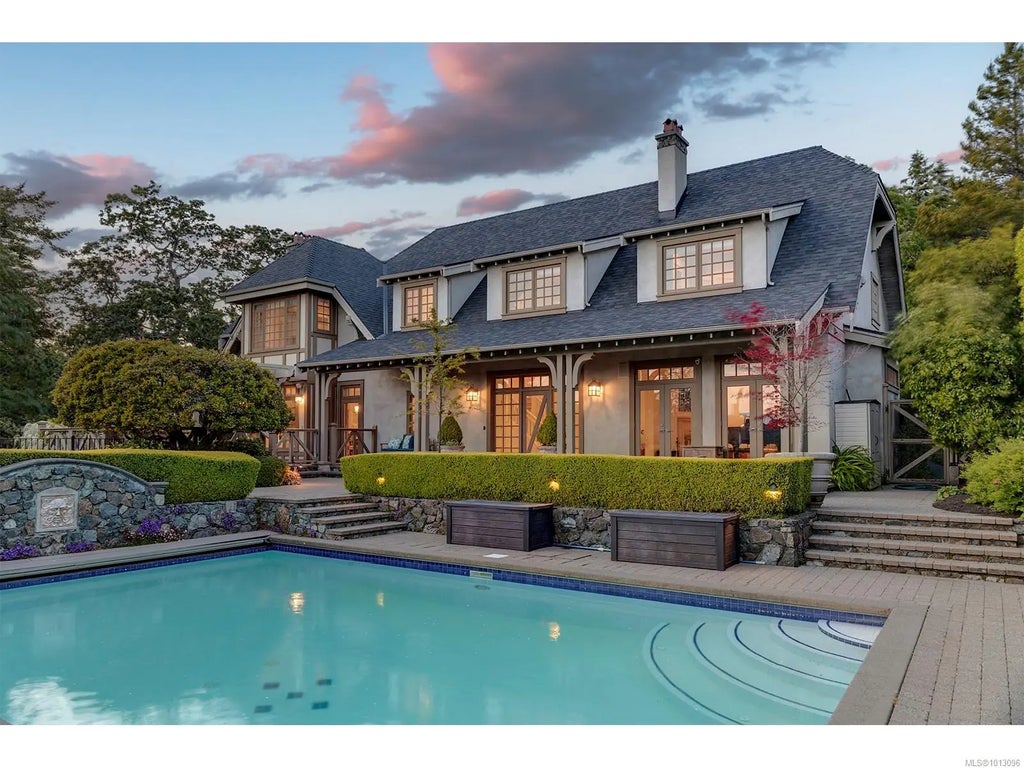 Situated in the heart of Ten Mile Point, this captivating custom residence blends timeless elegance with architectural mastery and the finest materials. Positioned high with views of Cadboro Bay, this .50-acre south-facing estate is the perfect setting for the 5,000+ sq. ft. home, complete with manicured gardens, stone walls, water features and a custom in-ground pool. Designed for seamless indoor–outdoor living, the main floor offers a refined yet relaxed lifestyle, enhanced by the area’s unique microclimate of warmer days & sun-filled evenings. Principal rooms grace the main level, with 4 bedrooms and 3 baths above, and an additional bed & bath below. The sumptuous primary retreat spans its own wing with a spa-inspired bath, fireplace, private sitting area and breathtaking ocean views from your bedside. A grand gourmet kitchen anchors the home with dining-area fireplace, expansive island and direct access to a wisteria-covered heated deck, expansive terraces and tranquil fountains.